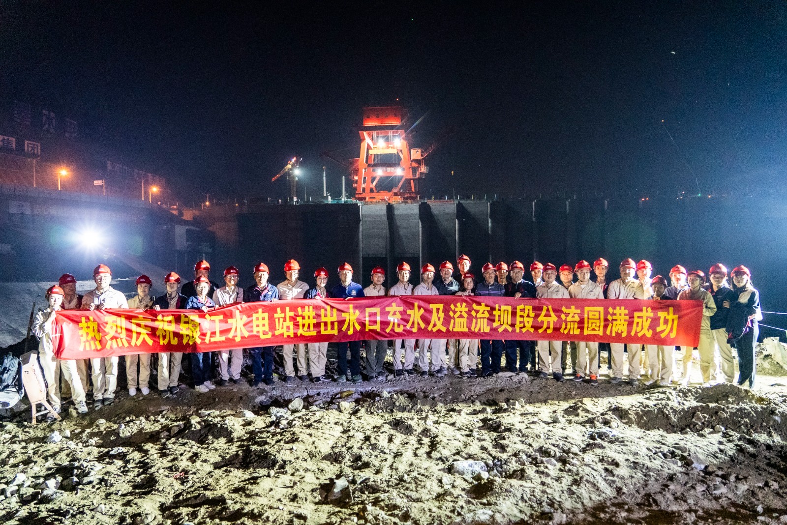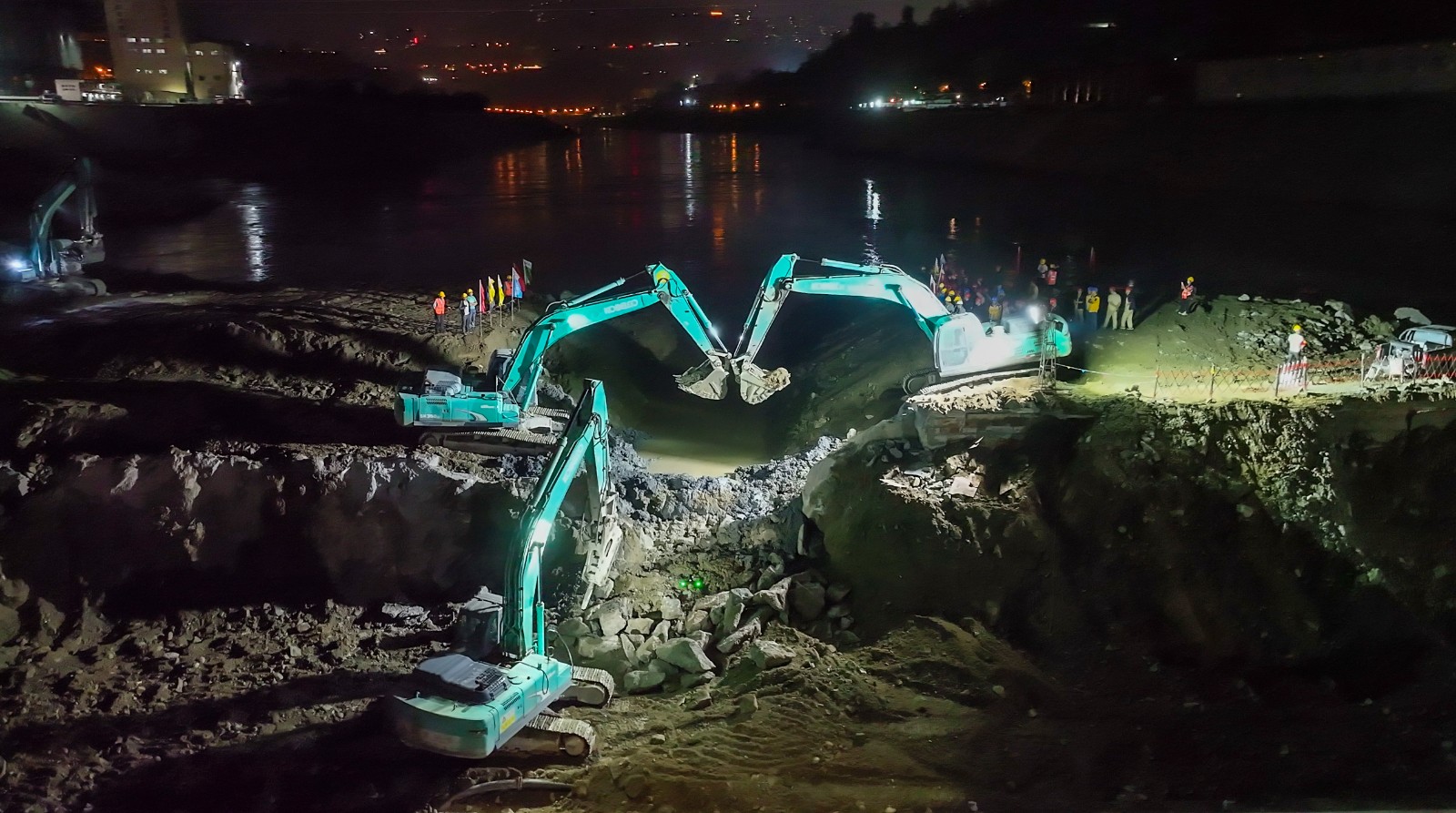 10月25日晚,隨著指令響起,十余臺挖掘機(jī)在二期上游圍堰右岸進(jìn)行破口開挖,奔騰的金沙江水隨即涌入主河床廠房與溢流壩上游,充水平壓后江水經(jīng)溢流壩段流向下游,銀江水電站成功實現(xiàn)分流。這一重要進(jìn)展為按期完成導(dǎo)流明渠截流打下堅實基礎(chǔ),也標(biāo)志著銀江水電站首臺機(jī)組投產(chǎn)發(fā)電正式進(jìn)入倒計時階段。