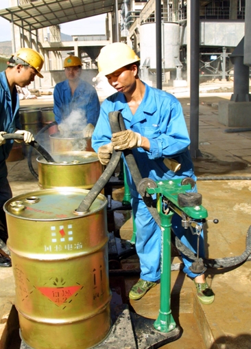 圖四:災(zāi)情發(fā)生后,川投化工號召全體職工“立足本職,加倍努力,以實際行動支援災(zāi)區(qū)”(圖為生產(chǎn)一線職工灌裝成品黃磷時情景)。