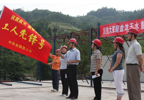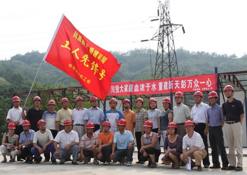 授旗儀式結(jié)束后,大家在鮮紅的“工人先鋒號(hào)”旗幟下合影,從廢墟中站起來(lái)的天彭電力廣大職工們臉上露出了自豪的笑容。望著迎風(fēng)招展的紅旗,郭勇總經(jīng)理笑著問(wèn)大家準(zhǔn)備把這面光榮的旗幟插在哪里,同志們高聲回答:報(bào)告郭總,報(bào)告各位領(lǐng)導(dǎo),我們要把“工人先鋒號(hào)”的紅旗插遍天彭電力抗震救災(zāi)、重建家園的每一個(gè)陣地!