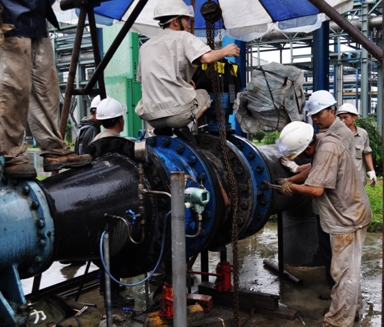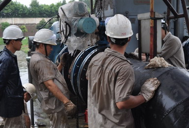 由于16日晚到17號(hào)上午的持續(xù)暴雨,造成了江邊取水泵房旁的山體塌方,廠區(qū)取水管道,電線電纜統(tǒng)統(tǒng)拉斷,取水工作已無法進(jìn)行。公司領(lǐng)導(dǎo)迅速組織各部門緊急會(huì)診,提出新敷設(shè)管道并入樂電天威江邊取水管道的方案,在得到樂電天威的支持后立即實(shí)施,電氣維修員在最短的時(shí)間內(nèi)搶修好配電箱,建立了臨時(shí)施工電源,確保了碰口工作順利完成。
