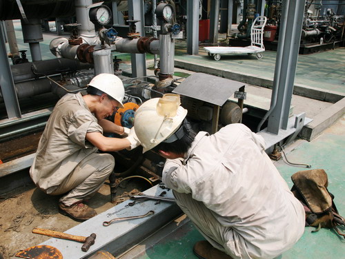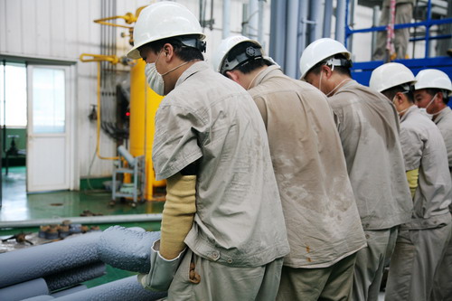 每年七月、八月高溫天氣是多晶硅生產(chǎn)設(shè)備故障的頻發(fā)期,十分不利于多晶硅的生產(chǎn)。尤其在今年,持續(xù)的高溫“烤”驗著新光人的意志和多晶硅生產(chǎn)設(shè)備的安全。為了實現(xiàn)月產(chǎn)100噸的目標,新光人懷著飽滿的熱情,堅持奮戰(zhàn)在一線。我們看到:烈日下的巡檢人員,認真仔細地對工序設(shè)備儀表進行檢查,沒有半點松懈,工作服被汗水浸濕一次又一次;設(shè)備檢修員頂著烈日、冒著酷暑,順利完成了HCl冷凝單元壓縮機、鹽水冷凍機組、氫化爐檢修、淋洗塔清堵與消缺、電氣防雷設(shè)備安裝、硅芯爐檢修、鍋爐檢修、儀表各系統(tǒng)消缺、重大關(guān)鍵設(shè)備巡檢等任務(wù);回收工段的操作員站在CDI設(shè)備前仔細記錄著每一個參數(shù),監(jiān)控溫度變化;還原爐裝拆工序的操作員冒著操作環(huán)境的高溫,熟練有序的進行裝拆爐,保證質(zhì)量的情況下盡量縮短裝拆爐時間;老專家們堅守在現(xiàn)場悉心指導(dǎo)技術(shù)人員做技改實驗;為搶修江邊水泵,基建人員頂著酷暑堅守崗位,組織現(xiàn)場大型機械設(shè)備持續(xù)作業(yè)……
