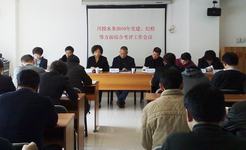 2010年12月1日下午,根據(jù)川投黨委統(tǒng)一安排,川投水務(wù)接受了川投集團(tuán)所屬企業(yè)2010年度黨建、紀(jì)檢等方面綜合考評(píng)第三組就企業(yè)黨建、黨風(fēng)廉潔建設(shè)、維護(hù)穩(wěn)定和社會(huì)治安綜合治理等方面的綜合考評(píng)??荚u(píng)組由組長(zhǎng)劉曉靈,成員王軍、姚建軍、賈英組成,川投水務(wù)本部全體員工和所屬公司員工代表共計(jì)25人參加了考評(píng)會(huì)議。