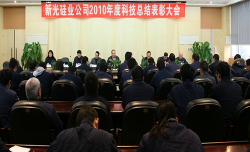 “科技就是生產(chǎn)力。”新光硅業(yè)公司自成立以來,高度重視科研開發(fā)和科技創(chuàng)新。2011年1月6日,公司召開2010年度科技大會,樂山市科技局領(lǐng)導(dǎo)、公司領(lǐng)導(dǎo)、專家、各部門負(fù)責(zé)人、科研課題組負(fù)責(zé)人以及公司科技人員參加了會議,會議由公司副總經(jīng)理鐘志翔主持。