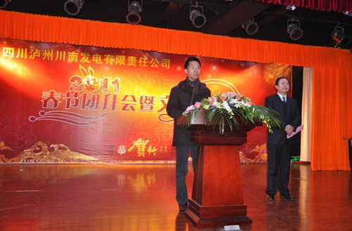 晚7:00,團(tuán)拜會(huì)開始。會(huì)議由黨委書記唐得旗主持,他提前向大家拜年,祝大家闔家安康,萬事如意??偨?jīng)理李勝章作了熱情洋溢的新春致辭。李總在講話中回顧了公司2010年的主要工作和取得的成績(jī),他說:2010年是公司機(jī)組投產(chǎn)以來生產(chǎn)任務(wù)最重、檢修項(xiàng)目最多、技改任務(wù)最緊、環(huán)保壓力最大的一年,又是機(jī)組非停次數(shù)最少、成本控制最好、執(zhí)行力最強(qiáng)、全體員工最?yuàn)^進(jìn)、最給力的一年。對(duì)職工的無私奉獻(xiàn),李總代表公司表示衷心感謝,并向全體職工和家屬致以最誠(chéng)摯的節(jié)日問候和祝福。對(duì)于今年,李總強(qiáng)調(diào):2011年,是實(shí)施“十二五”規(guī)劃的開局之年,也是公司徹底打破環(huán)保瓶頸制約、開創(chuàng)發(fā)展新局面的關(guān)鍵之年。公司將以安全生產(chǎn)為基礎(chǔ),市場(chǎng)營(yíng)銷為導(dǎo)向,深入推進(jìn)節(jié)能減排,全方位開展成本控制,完成#1機(jī)組脫硫技改,確保全年發(fā)電50億千瓦時(shí)。他號(hào)召公司全體職工攜手共進(jìn),以更加飽滿的熱情、更加務(wù)實(shí)的態(tài)度、更加昂揚(yáng)的斗志,共同譜寫川南發(fā)電公司“十二五”炫麗的開局篇章!