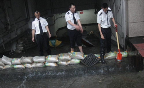 秩序維護(hù)員冒雨用沙袋成功阻止了驟雨流進(jìn)地下車庫(kù)