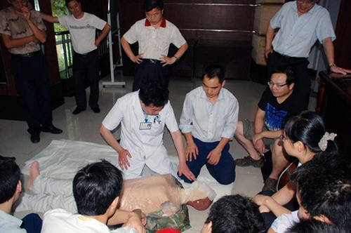 培訓(xùn)會(huì)上,謝繼林醫(yī)生結(jié)合發(fā)電企業(yè)生產(chǎn)現(xiàn)場(chǎng)發(fā)生的真實(shí)案例,采用理論講解、圖示和現(xiàn)場(chǎng)演示相結(jié)合的方式,詳細(xì)講解了 “最新國(guó)際心肺復(fù)蘇指南”、“SF6封閉組合電器漏氣及處理措施”、“觸電燒傷及其搶救措施”、“淺部軟組織創(chuàng)傷及其處理”、“熱力燒傷及其處理”、“急性損傷中毒的化學(xué)、物理因素及其搶救步驟和原則”等方面的知識(shí),并利用橡皮人進(jìn)行了模擬救護(hù)操作示范。電站現(xiàn)場(chǎng)參培訓(xùn)人員按照拍、喊、看、摸、聽(tīng)等步驟,對(duì)橡皮人分別進(jìn)行了單人和雙人胸外按壓、口對(duì)口(鼻)人工呼吸救護(hù)操作。謝繼林醫(yī)生對(duì)操作不規(guī)范的員工認(rèn)真進(jìn)行了糾正,直到全部掌握操作要領(lǐng)并通過(guò)檢測(cè)。