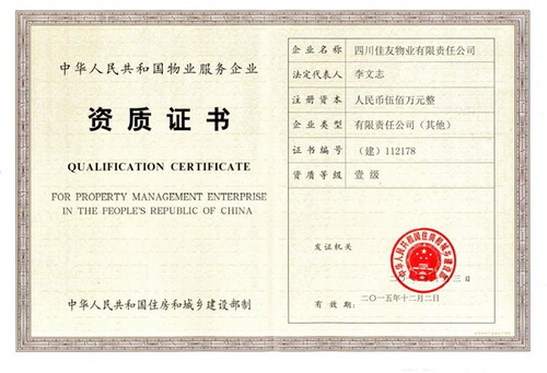 2012年12月3日,四川佳友物業(yè)有限責(zé)任公司正式獲得由國(guó)家住建部頒發(fā)的物業(yè)服務(wù)企業(yè)一級(jí)資質(zhì),標(biāo)志著佳友物業(yè)的服務(wù)水平已經(jīng)得到了行業(yè)主管部門和市場(chǎng)的廣泛認(rèn)可,不但掃清了市場(chǎng)運(yùn)作和項(xiàng)目發(fā)展方面的障礙,也為躋身于全省先進(jìn)物業(yè)管理企業(yè)行列奠定了堅(jiān)實(shí)的基礎(chǔ)。