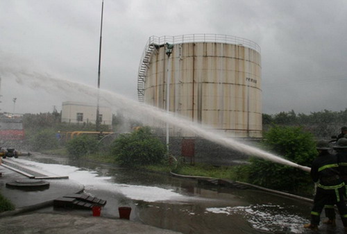 演習設定,運行值班人員在發(fā)現(xiàn)油庫著火情況后,迅速采取現(xiàn)場關閉進出口油閥,并用泥沙將因油泵房附近近200公升的積油形成的流動火隔離,同時將火情迅速上報,公司立即宣布啟動油庫著火應急預案。隨后各參演單位迅速到位,在搶險應急指揮部的指揮下,對燃油系統(tǒng)進行了隔離,并切斷了油庫區(qū)所有電源,并迅速疏散周邊人員,設置了警戒線,消防隊員快速利用油罐區(qū)內(nèi)的固定泡沫滅火裝置的泡沫槍和消防車的泡沫槍從各個方向集中對準火源中心處噴射,封住火焰使油氣隔絕缺氧熄滅。同時,參演義務消防人員迅速趕赴現(xiàn)場協(xié)助專職消防隊進行滅火。