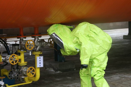 川南發(fā)電公司脫硝技改項(xiàng)目采用液氨作為脫硝反應(yīng)劑,液氨屬重大危險(xiǎn)源,一旦發(fā)生泄漏,將可能引發(fā)中毒、爆炸等不安全事件,為此公司高度重視,不斷加強(qiáng)安全預(yù)防、教育培訓(xùn)相關(guān)工作。為檢驗(yàn)和提高員工對(duì)液氨泄漏事故的應(yīng)急處置能力,進(jìn)一步增強(qiáng)員工安全意識(shí),公司專門組織了此次事故演練。14:30,演練正式開始。事故假設(shè)兩名化學(xué)運(yùn)行人員在巡視檢查時(shí)發(fā)現(xiàn)#1液氨儲(chǔ)罐出口管路一次手動(dòng)門后法蘭泄露,泄露液氨化為氣態(tài)氨并迅速擴(kuò)散,現(xiàn)場(chǎng)空氣中氨濃度超標(biāo),員工A中毒昏倒。員工B迅速佩戴防護(hù)面具,把中毒人員往上風(fēng)口運(yùn)送,并向值長(zhǎng)匯報(bào)。14:38,應(yīng)急人員相繼到達(dá)現(xiàn)場(chǎng),嚴(yán)格按照應(yīng)急演練方案進(jìn)行處置工作。14:42分,一名設(shè)備部人員身著防護(hù)服、佩戴正壓式空氣呼吸器,在運(yùn)行人員的配合下,成功隔離漏泄點(diǎn),應(yīng)急演練結(jié)束。