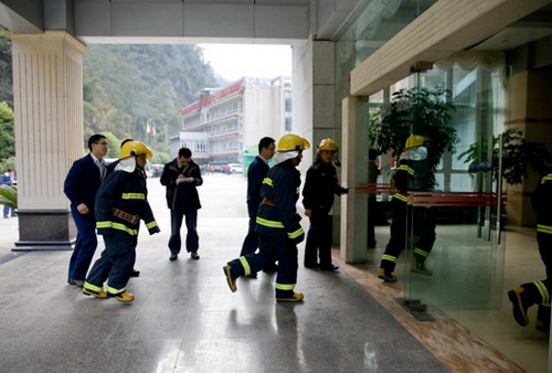 情況緊急,值班人員接到報警后立即向火災(zāi)事故應(yīng)急辦公室技術(shù)與安全部負(fù)責(zé)人報告,爾后又層層向公司現(xiàn)場值班領(lǐng)導(dǎo)、公司總經(jīng)理報告。總經(jīng)理指示立即成立火災(zāi)事故應(yīng)急救援指揮部,現(xiàn)場由熊宇負(fù)責(zé)指揮。按總指揮要求,現(xiàn)場指揮長命令:拉響警報器,啟動火災(zāi)事故二級應(yīng)急響應(yīng),疏散組快速組織接待中心大樓人員安全撤離,滅火行動組立即組織兼職消防隊員、義務(wù)消防隊員投入滅火戰(zhàn)斗......一道道緊急命令從指揮部發(fā)出,各應(yīng)急救援小組快速集結(jié),按公司火災(zāi)事故應(yīng)急預(yù)案有序開展救援行動。
