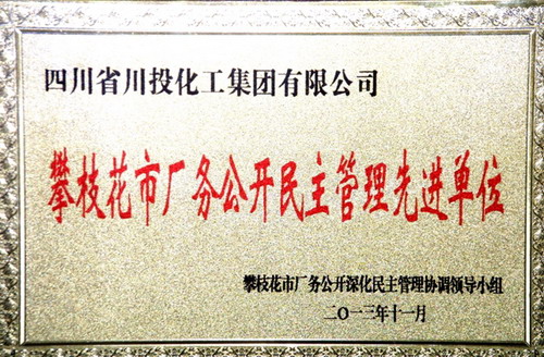 2013年11月26日,攀枝花市廠務(wù)公開(kāi)民主管理總結(jié)暨推進(jìn)表彰會(huì)在攀枝花市工人文化宮舉行。四川省川投化學(xué)工業(yè)集團(tuán)有限公司榮獲攀枝花市廠務(wù)公開(kāi)民主管理先進(jìn)單位,總經(jīng)理王少甫同志榮獲廠務(wù)公開(kāi)民主管理先進(jìn)個(gè)人。