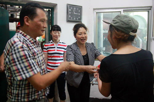 自入伏以來,氣溫節(jié)節(jié)攀升,連續(xù)的高溫天氣威脅著生產(chǎn)崗位職工們的身心健康,同時也牽動著上級領(lǐng)導(dǎo)的心。7月28日,在公司杜勤、鐘衛(wèi)旗等領(lǐng)導(dǎo)的陪同下,川投集團慰問組一行首先來到煤矸石發(fā)電廠,聽說上級領(lǐng)導(dǎo)特意來看望慰問大家,檢修車間的工人師傅們放下手上的活等候在了廠區(qū)大門,穆主席將切好的西瓜遞到工人師傅手中并關(guān)切地說:“高溫酷暑,你們?nèi)匀粓允卦诠ぷ鲘徫簧戏浅P量?,我代表集團對你們的辛勤工作表示感謝!在夏季高溫環(huán)境下大家一定要做好防暑降溫和自身保護,確保安全生產(chǎn)。”慰問組一行先后到電廠鍋爐、汽機等高溫生產(chǎn)崗位,以及礦區(qū)炭壩等露天作業(yè)場所將清爽解渴的冰粉,香甜可口的西瓜送到職工們手中,親切問詢職工們的生產(chǎn)生活情況,并叮囑他們注意安全、保重身體。一句句關(guān)切的話語尤如一陣陣清涼的風吹進了職工們的心坎兒里,大家紛紛表示雖然公司目前處于非常困難的時期,集團領(lǐng)導(dǎo)的關(guān)懷我們信心倍增,作為企業(yè)的一員我們會理解和支持公司的各項改革舉措,以更加飽滿的熱情努力工作,團結(jié)一心,與企業(yè)共渡難關(guān)。(羅誼莉)