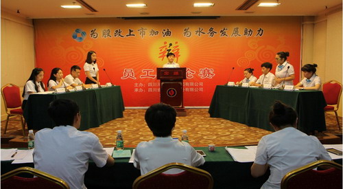 為扎實(shí)推進(jìn)精神文明建設(shè),助力川投水務(wù)股改上市與穩(wěn)健發(fā)展,進(jìn)一步錘煉員工邏輯思維能力和口頭表達(dá)能力,川投水務(wù)于9月11日至14日在川投水務(wù)宏源燃?xì)夤?1樓會議室舉辦了以“為股改上市加油.為水務(wù)發(fā)展助力”為主題的2016年員工辯論賽。川投水務(wù)總會計(jì)師祝瑗、總經(jīng)理助理兼綜合部經(jīng)理?xiàng)钪緞偝鱿吮敬螁T工辯論賽。川投水務(wù)本部及所屬8家子公司共10支隊(duì)伍及相關(guān)人員59人參加了此次辯論賽。