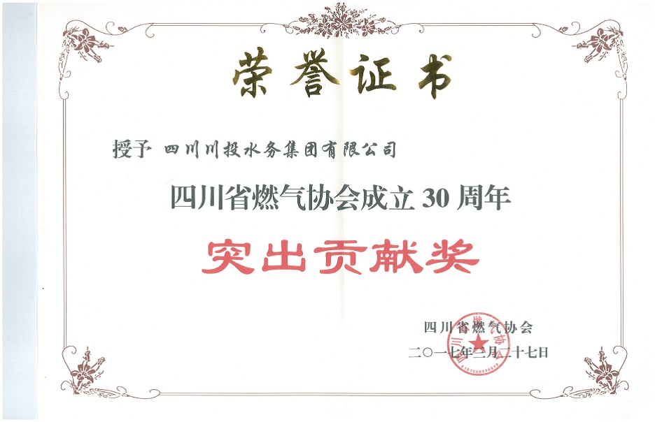 2017年3月29日至31日,四川省燃?xì)鈪f(xié)會(huì)召開(kāi)了協(xié)會(huì)成立30周年總結(jié)大會(huì)暨八屆二次會(huì)員代表大會(huì)。會(huì)上,川投水務(wù)被授予“四川省燃?xì)鈪f(xié)會(huì)成立30周年突出貢獻(xiàn)獎(jiǎng)”。