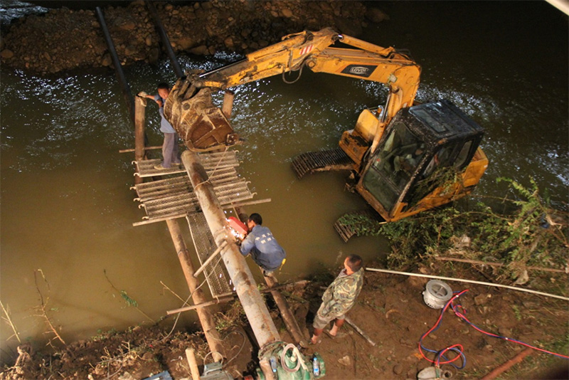全力打通供水主管,從源頭化解供水危機(jī)。此次被供水沖斷的兩條供水主管分別鏈接著觀音峽和偏巖子兩處水源,也是萬源公司的兩處主水源,經(jīng)萬源公司工作人員現(xiàn)場巡查,發(fā)現(xiàn)這兩條水管受損點分別位于觀音峽取水主管的下游和偏巖子取水主管的上游,經(jīng)萬源公司總經(jīng)理王文川、川投集團(tuán)生產(chǎn)技術(shù)部經(jīng)理王鎮(zhèn)及現(xiàn)場技術(shù)人員研究,決定在觀音峽取水口處將兩條取水管道進(jìn)行并管改造施工,使觀音峽水源通過偏巖子下游未損壞的供水主管為水廠供水,解決水廠缺水的燃眉之急。