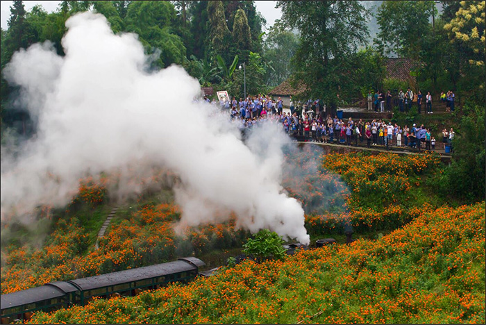 由于調整了花期,今年的國慶黃金周正值《中國國家地理》雜志評選的四川100個最美觀景?拍攝點之一的段家灣萬壽菊盛開,游客們登高飽覽嘉陽小火車從花海間蜿蜒的鐵軌吭哧駛過的勝景,紛紛贊不絕口。亮水沱蒸汽表演、黃村井奇幻之旅、芭蕉溝懷舊漫步更是讓游客們驚嘆不已。