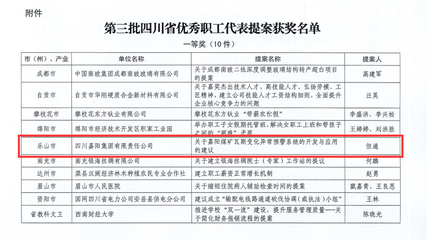 四川省總工會下發(fā)的《四川省廠務公開聯(lián)席會議辦公室關(guān)于第三批四川省優(yōu)秀職工代表提案評選結(jié)果的通報》文件中指出,為深入學習貫徹習近平新時代中國特色社會主義思想和黨的十九大、中國工會十七大精神,進一步深化“聚焦基層促民主,共建共享雙維護”主題活動,省廠務公開聯(lián)席會議辦公室在全省范圍內(nèi)組織開展了第三批四川省優(yōu)秀職工代表提案征集推薦活動。據(jù)悉,活動共征集到職工代表提案350余件。省廠務公開辦按照“三好一化”標準和“好中選優(yōu)”原則,對所有提案進行了全面深入的綜合評審,擇優(yōu)評定出一等獎10件、二等獎20件、三等獎30件,其中嘉陽集團工會推薦優(yōu)秀職工代表但通《關(guān)于嘉陽煤礦瓦斯變化異常預警系統(tǒng)的開發(fā)與應用的建議》的提案榮獲一等獎。
