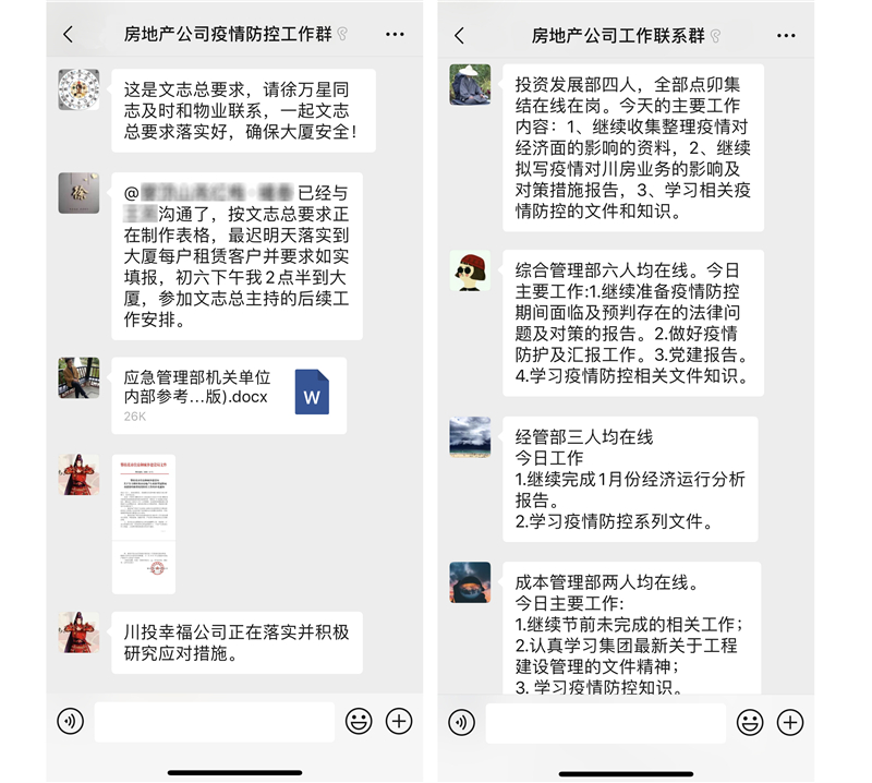 居家網(wǎng)絡辦公,變的是工作地點,不變的是川房人對公司的責任。2月10日公司開始有序復工,為保障公司和員工的安全,實行帶班領導+部門負責人+一般員工到川投大廈值班值守、其余人員居家辦公的工作模式,通過“川投云平臺”、“企業(yè)微信”等在線辦公軟件進行工作溝通,明確工作內(nèi)容和目標,帶著問題和解決辦法進行會議和日常交流。在線對每日進行工作總結(jié)和復盤,確保疫情防控期間各項工作不斷檔、不脫節(jié)。