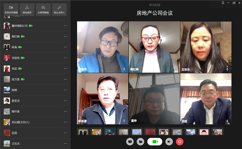 網(wǎng)絡視頻會議,科技的力量不是要改變世界,而是在環(huán)境改變的時候能夠從容應對。房地產(chǎn)公司領導班子帶頭試行網(wǎng)絡辦公,積極組織相關人員召開各類視頻會議,強化現(xiàn)階段各單位溝通,以最快速度掌握疫情形勢下公司現(xiàn)階段工作難點和痛點,積極謀劃應對方策。2月17日,召開了共17人參加的網(wǎng)絡行政例會,董事長高紅梅安排部署了七項重點工作;2月18日,公司領導班子帶頭和員工參加了疫情對房地產(chǎn)企業(yè)的影響及對策專題培訓;2月19日,召開了共15人參加支委會和總經(jīng)理辦公聯(lián)席會議,通過了七個議案,并安排了近期重點工作。