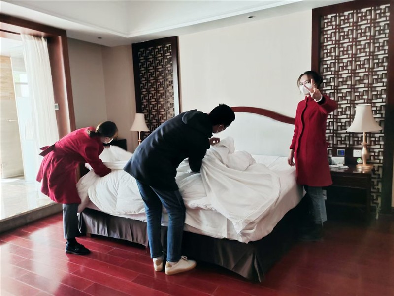 12月16日酒店又迎來大批客人入住,為確保新到店客人能及時(shí)、順利入住,酒店一百多間退房急需在當(dāng)日中午13點(diǎn)前全部完成清掃、消殺工作。因大部分客人退房集中在11點(diǎn)左右,且已有部分客人抗原陽性,面臨人員缺、時(shí)間緊、任務(wù)重的挑戰(zhàn),酒店立即組織幫扶調(diào)度會,酒店駐店總經(jīng)理帶隊(duì)全體員工深入一線作業(yè),在有序分工安排后,各自奔赴“戰(zhàn)場”爭分奪秒、積極搶房。僅在兩個小時(shí)內(nèi)便完成房間清掃、室內(nèi)整理、消殺換洗和入房引領(lǐng)工作,保證當(dāng)日兩百多名客人順利入住。