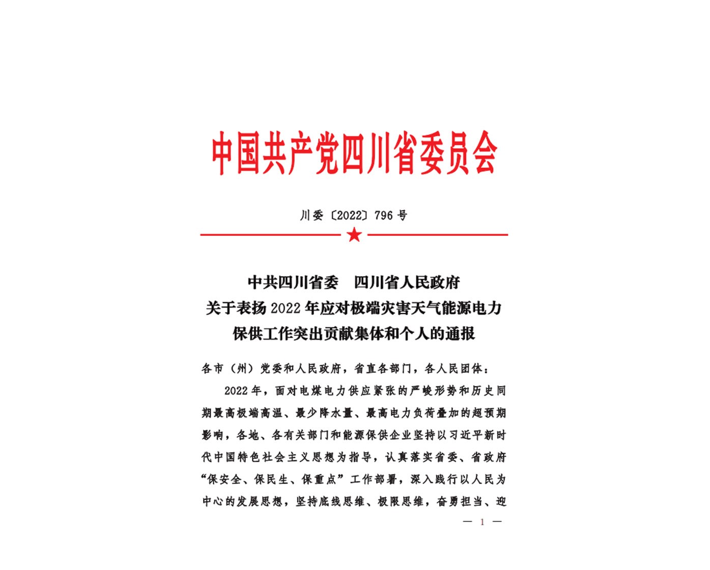 2022年12月31日,中國共產(chǎn)黨四川省委員會發(fā)布《關(guān)于表揚2022年應(yīng)對極端災(zāi)害天氣能源電力保供工作突出貢獻集體和個人的通報》(川委〔2022〕796號),川投燃電集團黨委書記、董事長姚欣、達州氣電公司總經(jīng)理助理廖安政榮獲“2022年應(yīng)對極端災(zāi)害天氣能源電力保供工作突出貢獻”獎。這是省委、省政府對川投燃電集團能源保供工作的高度肯定。