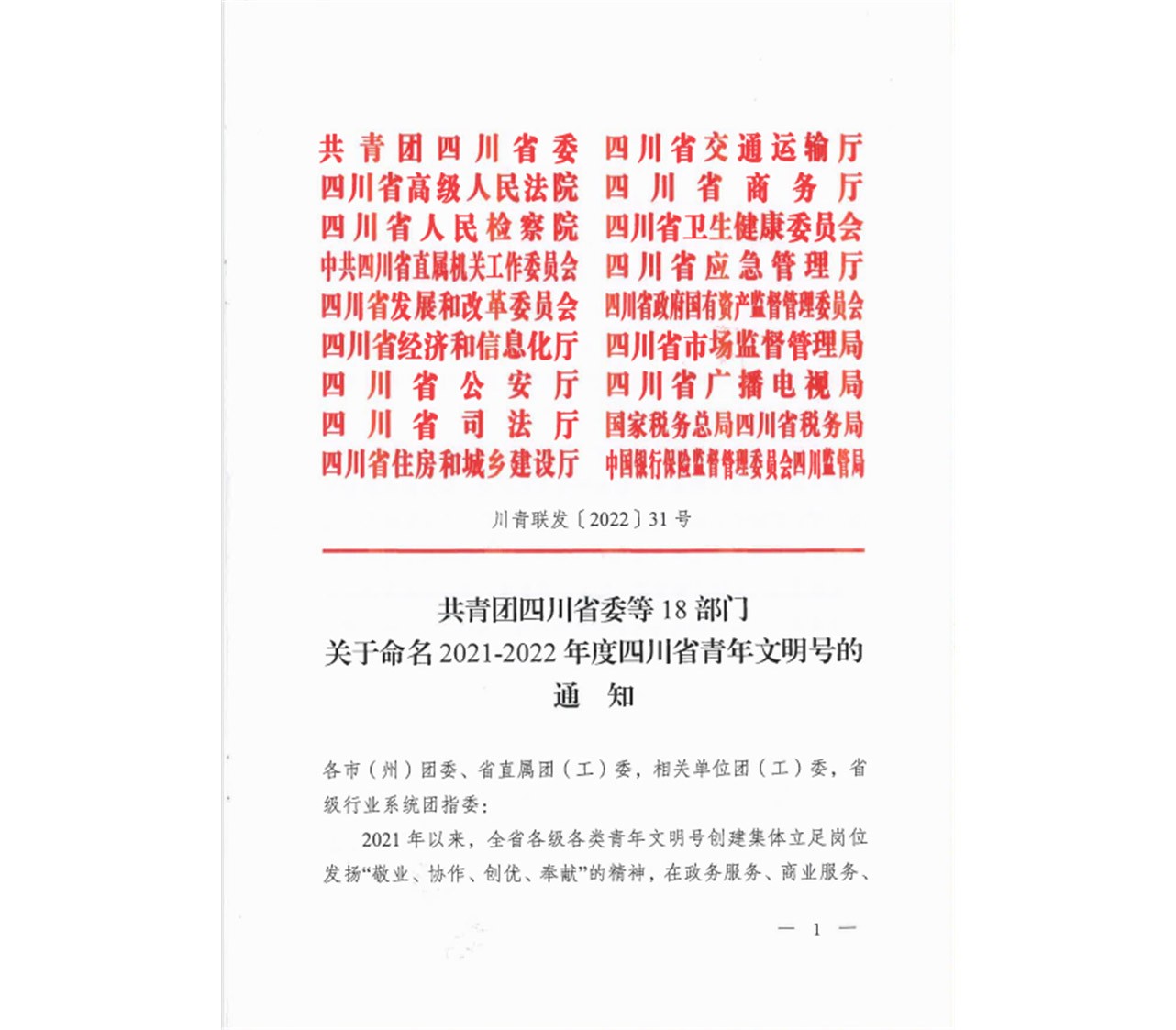近日,共青團四川省委等18家單位聯(lián)合發(fā)布《關于命名2021-2022年度四川省青年文明號的通知》,川投燃電集團所屬宏源氣司燃氣工程安裝公司因“政治素質好、職業(yè)道德好、職業(yè)技能好、工作作風好、崗位業(yè)績好”,受到團省委肯定,被授予“2021-2022年度四川省青年文明號”稱號。