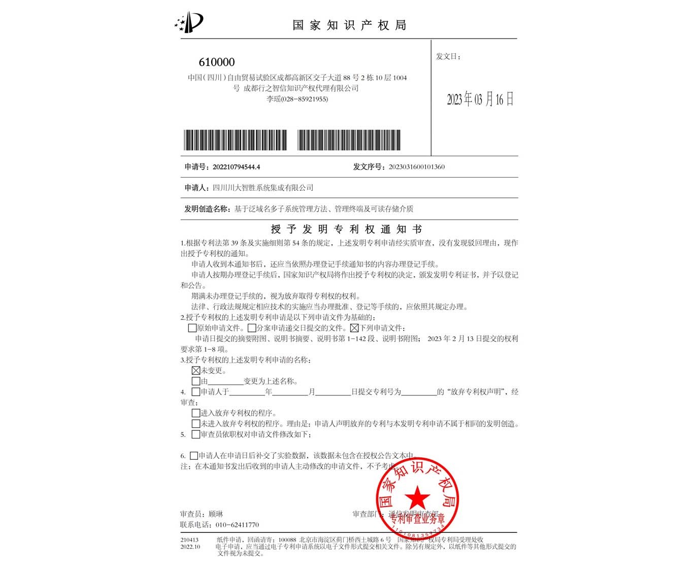 近日,川投信產(chǎn)所屬智勝集成收到來自國家知識(shí)產(chǎn)權(quán)局的兩份發(fā)明專利授權(quán)通知,兩項(xiàng)技術(shù)分別為“基于泛域名多子系統(tǒng)管理方法、管理終端及可讀存儲(chǔ)介質(zhì)”和“一種互聯(lián)網(wǎng)大數(shù)據(jù)分析方法及系統(tǒng)”。