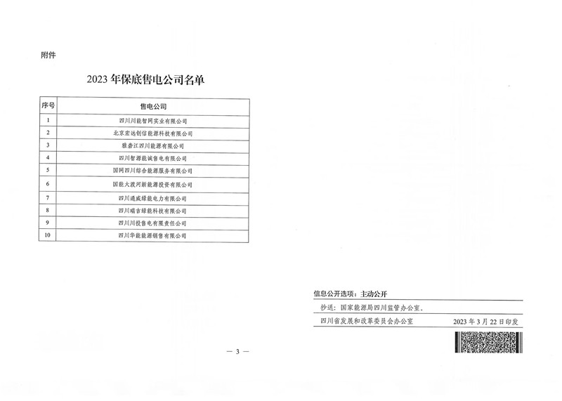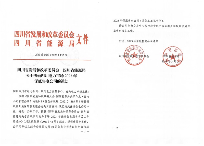 3月22日,四川省發(fā)展和改革委員會(huì)、四川省能源局印發(fā)了《關(guān)于明確四川電力市場(chǎng)2023年保底售電公司的通知》(川發(fā)改能源〔2023〕132號(hào)),四川川投售電有限責(zé)任公司被評(píng)定為四川電力市場(chǎng)2023年保底售電公司。