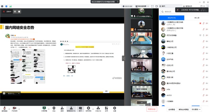 為貫徹落實(shí)網(wǎng)絡(luò)安全和信息化工作有關(guān)要求,進(jìn)一步提升廣大員工的網(wǎng)絡(luò)與信息安全意識(shí),結(jié)合4?15全民國(guó)家安全教育日相關(guān)活動(dòng)安排,4月11日下午,川投集團(tuán)辦公室以線上方式組織召開(kāi)了網(wǎng)絡(luò)安全意識(shí)專(zhuān)題培訓(xùn)會(huì)。