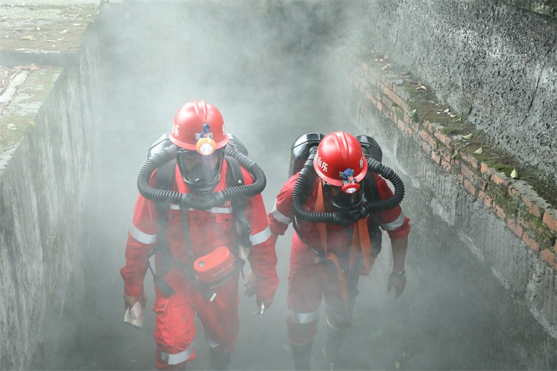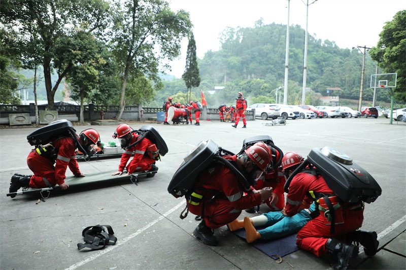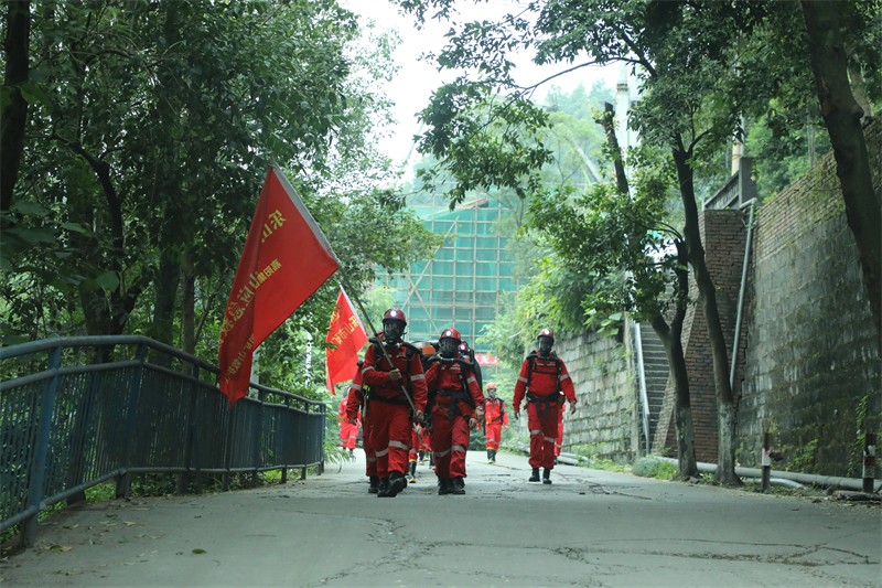 此次演練以復(fù)雜條件下的救援演練為主,全程佩帶重達(dá)13公斤的氧氣呼吸器,著重在于培養(yǎng)救援隊(duì)員的耐氧度和高濕條件下的佩機(jī)忍耐力。戰(zhàn)前分工、受領(lǐng)任務(wù)、集合隊(duì)伍、整裝待發(fā),上午9點(diǎn)30分,萬(wàn)米戴機(jī)行走在指揮員響亮的口令中拉開了演練的序幕,佩帶齊全裝備的隊(duì)員們向著目的地一路進(jìn)發(fā),一身國(guó)旗紅在礦區(qū)、在山間路上格外引人注目?;Q氧氣瓶、傷員急救包扎轉(zhuǎn)運(yùn)模擬、安設(shè)高泡滅火機(jī)滅火、高溫濃煙,各小隊(duì)按照任務(wù)分工迅速到達(dá)指定地點(diǎn)有序展開工作。在兩個(gè)多小時(shí)的訓(xùn)練中,隊(duì)員們團(tuán)結(jié)協(xié)作、密切配合,圓滿完成了指定任務(wù)。通過(guò)聯(lián)合演練,檢驗(yàn)了隊(duì)員們的身體素質(zhì)、技戰(zhàn)術(shù)水平、應(yīng)急反應(yīng)能力和團(tuán)結(jié)協(xié)作能力,確保隊(duì)伍戰(zhàn)時(shí)拉得出、沖得上、打得贏。