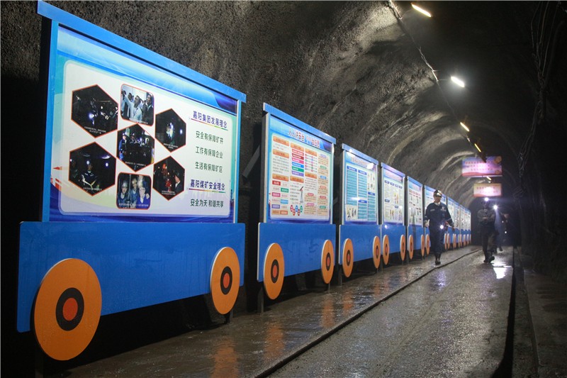 總長(zhǎng)38米的安全文化長(zhǎng)廊建在天錫井+215m至+160m水平聯(lián)絡(luò)平巷左側(cè),共設(shè)計(jì)12個(gè)版塊,每個(gè)版塊長(zhǎng)2.4米、高1.2米,采用硬質(zhì)PVC板UV制作,鋁合金包邊后固定于方鋼落地支撐架上,外觀是一節(jié)火車車廂,長(zhǎng)廊整體呈現(xiàn)出火車奔跑的動(dòng)感,內(nèi)容包括集團(tuán)公司發(fā)展理念與安全理念、安全生產(chǎn)月主題核心版塊、全面落實(shí)企業(yè)安全生產(chǎn)主體責(zé)任、安全制度措施、安全生產(chǎn)知識(shí)教育宣傳欄、職業(yè)病危害與防治、事故案例分析、礦井瓦斯事故、冒頂事故、瓦斯事故、透水事故、火災(zāi)事故、井下應(yīng)急救助安全教育專欄等。“火車跑得快,全靠車頭帶,長(zhǎng)廊就是一列火車,象征著老國(guó)企帶著科學(xué)發(fā)展理念在新時(shí)代奔跑。”嘉陽(yáng)煤礦長(zhǎng)廊設(shè)計(jì)負(fù)責(zé)人介紹說(shuō)。
