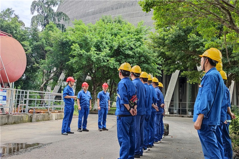 “匯報(bào)主值,循環(huán)水濃硫酸槽車接卸過(guò)程中,卸酸泵進(jìn)口管道接頭突然大量泄漏濃硫酸,并有少量濃硫酸灑落在圍堰外,可能造成環(huán)境污染”,隨著對(duì)講機(jī)傳來(lái)一陣急促的聲音,演習(xí)正式開始。化水值班員發(fā)現(xiàn)泄漏后,第一時(shí)間切斷卸酸泵電源,要求槽車司機(jī)穿戴好防護(hù)用品后關(guān)閉槽車緊急關(guān)斷閥,對(duì)卸酸系統(tǒng)進(jìn)行有效隔離后駛離至安全地帶,同步疏散無(wú)關(guān)人員,并匯報(bào)值長(zhǎng)現(xiàn)場(chǎng)濃硫酸泄漏情況。值長(zhǎng)接到匯報(bào)后立即安排檢修及運(yùn)行支援人員到場(chǎng)協(xié)同處置,化水值班員穿戴好防護(hù)用品進(jìn)入泄漏點(diǎn)進(jìn)行系統(tǒng)隔離,用現(xiàn)場(chǎng)存放的消石灰封堵并中和外漏濃硫酸,沖洗圍堰內(nèi)泄漏余酸,并將圍堰內(nèi)積水轉(zhuǎn)運(yùn)至運(yùn)行中的涼水塔,防止造成環(huán)境污染。