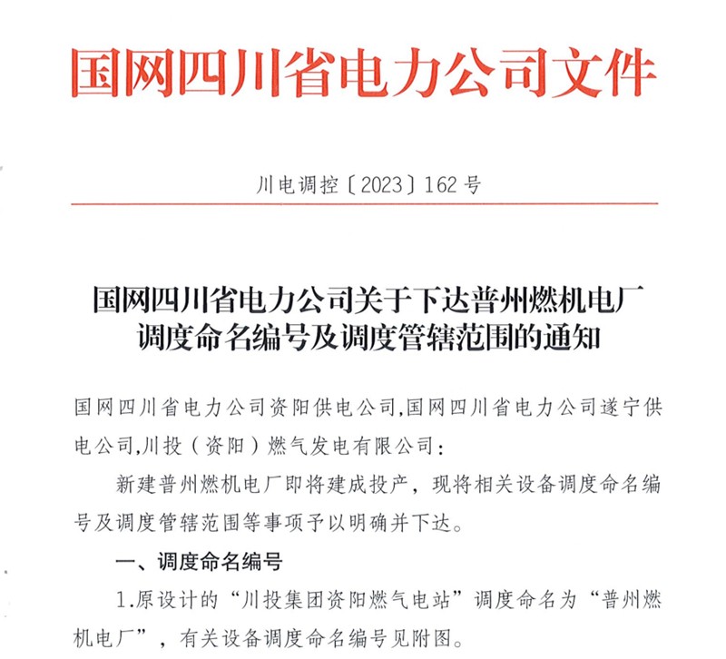 9月25日,資陽氣電收到國網(wǎng)四川省電力公司下發(fā)的《國網(wǎng)四川省電力公司關(guān)于下達(dá)普州燃機電廠調(diào)度命名編號及調(diào)度管轄范圍的通知》,川投集團(tuán)資陽燃?xì)怆娬菊{(diào)度正式命名為:“普州燃機電廠”。