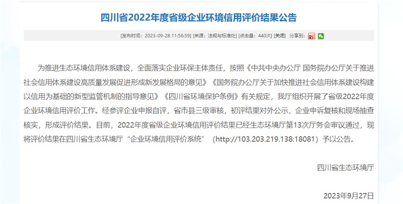近日,四川省生態(tài)環(huán)境廳公布了2022年度企業(yè)環(huán)境信用評(píng)價(jià)結(jié)果,公司再次喜獲“環(huán)保誠(chéng)信企業(yè)”榮譽(yù)稱(chēng)號(hào),這是公司連續(xù)第6年獲此殊榮。