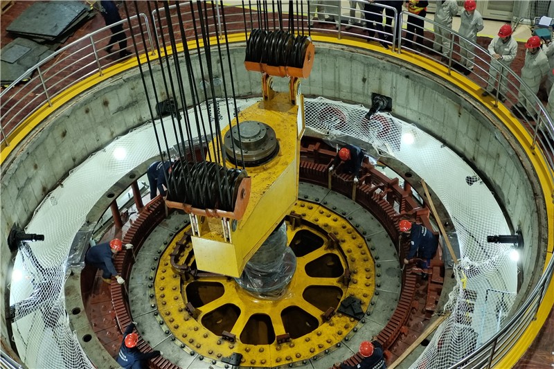上午9點50分,轉(zhuǎn)子吊裝前的一切準備工作就緒,現(xiàn)場工作負責人向楊坤匯報了轉(zhuǎn)子回裝的準備情況,并請示開始吊裝作業(yè)。楊坤在聽取了相關(guān)匯報后,下達轉(zhuǎn)子回裝指令。隨著一聲清脆的哨響,轉(zhuǎn)子緩緩升起,隨著行車移動徐徐向機坑靠近。經(jīng)過檢修人員1個多小時的鏖戰(zhàn),上午11時10分,大發(fā)1#機轉(zhuǎn)子按照既定路線平穩(wěn)回落至機坑,吊裝工作順利完成。