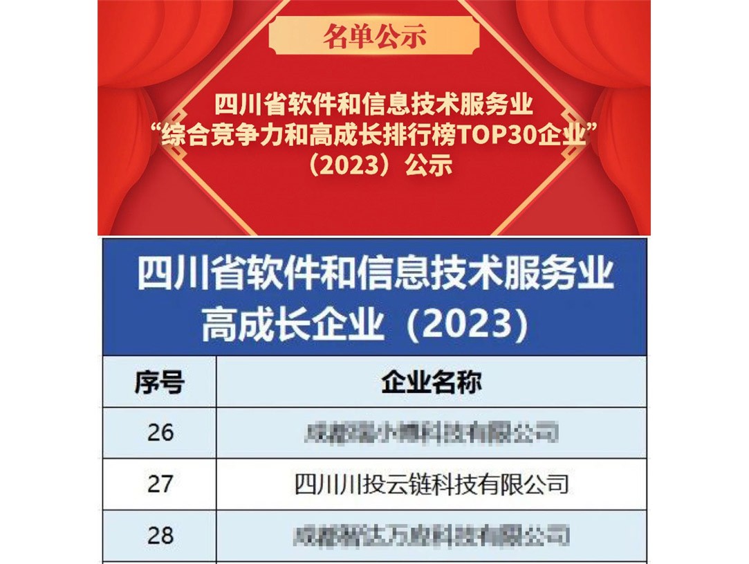 近日,四川省軟件行業(yè)協(xié)會(huì)完成了四川省軟件和信息技術(shù)服務(wù)業(yè)“綜合競爭力和高成長排行榜TOP30企業(yè)”(2023)公示,川投信產(chǎn)所屬川投云鏈憑借在科技創(chuàng)收能力、研發(fā)投入強(qiáng)度、產(chǎn)品競爭力等方面的突出表現(xiàn)入選高成長企業(yè)TOP30榜單。