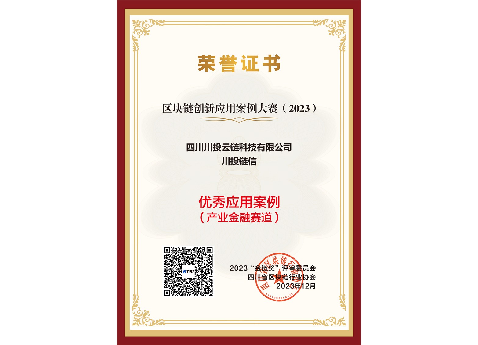 會(huì)上頒發(fā)了“2023金鏈獎(jiǎng)”,該獎(jiǎng)項(xiàng)由四川省區(qū)塊鏈行業(yè)協(xié)會(huì)和區(qū)塊鏈可信服務(wù)機(jī)構(gòu)聯(lián)盟評選,通過案例征集、技術(shù)測評和專家評審,來自全國的54個(gè)案例最終入圍。川投云鏈憑借在區(qū)塊鏈領(lǐng)域技術(shù)創(chuàng)新能力、產(chǎn)品研發(fā)等方面的成果,榮獲區(qū)塊鏈創(chuàng)新優(yōu)秀應(yīng)用案例獎(jiǎng)(產(chǎn)業(yè)金融賽道)。