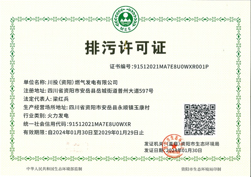 2024年1月30日,資陽燃氣電站新建工程項目順利取得資陽市生態(tài)環(huán)境局頒發(fā)的排污許可證。