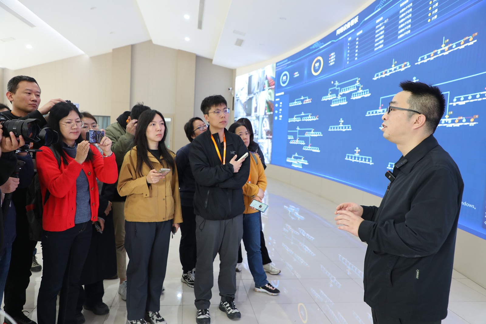 探訪團(tuán)部分記者以及中興通訊公司、重慶研究院18名來(lái)賓在集團(tuán)副總經(jīng)理、總工程師袁成金的陪同下前往了嘉陽(yáng)煤礦天錫井+215m水平中央水泵房,參觀了泵房中的5G網(wǎng)絡(luò)和通訊設(shè)施,試用了5G防爆手機(jī)的通訊功能,察看了無(wú)人值守啟動(dòng)水泵排水過(guò)程。大家在地面調(diào)度中心,透過(guò)巨屏看到了嘉陽(yáng)煤礦透明礦山信息系統(tǒng)成果展示,在采煤一隊(duì)智能化綜采地面遠(yuǎn)程操控室,聽(tīng)取了專(zhuān)業(yè)技術(shù)人員介紹智能化生產(chǎn)線建設(shè)與成效。一路上,大家聚焦信息技術(shù)、5G技術(shù)、智能化技術(shù)和集團(tuán)遠(yuǎn)景規(guī)劃等不斷提問(wèn),隨行的嘉陽(yáng)煤礦信息副總工程師但通和采掘副總工程師李有平耐心細(xì)致地給予講解答復(fù),氛圍友好而融洽。