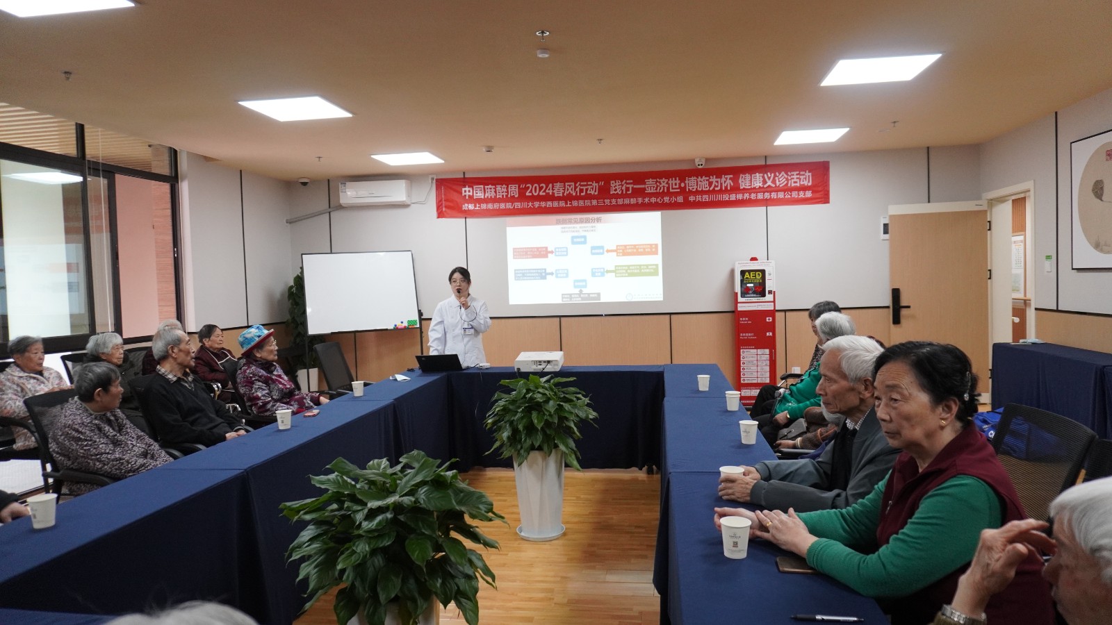 隨后,醫(yī)護(hù)人員們圍繞高血壓、骨質(zhì)疏松、跌倒風(fēng)險(xiǎn)等老年群體常見(jiàn)疾病進(jìn)行健康講座。講座中,各位長(zhǎng)者積極分享自身防治經(jīng)驗(yàn),并與醫(yī)生護(hù)士們進(jìn)行溝通交流。一堂健康講座,不僅為長(zhǎng)者帶來(lái)了醫(yī)生們專業(yè)的診療及防治建議,也加深了長(zhǎng)者們健康養(yǎng)老的思想意識(shí)。講座中,醫(yī)護(hù)人員們還為機(jī)構(gòu)工作人員詳細(xì)講解了AED使用和心肺復(fù)蘇操作規(guī)范,提升了養(yǎng)老機(jī)構(gòu)突發(fā)應(yīng)急處置的專業(yè)性和規(guī)范性。