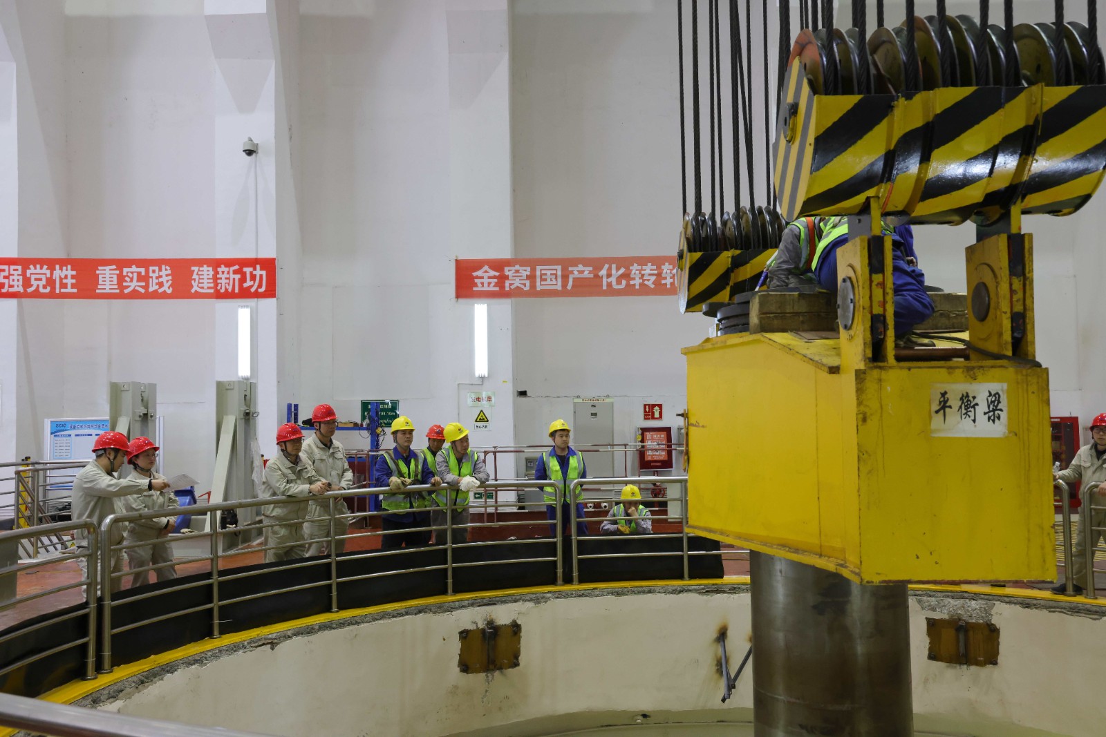 為確保轉(zhuǎn)子吊出一次性成功,轉(zhuǎn)子起吊前,田灣河公司機組大修監(jiān)理組專業(yè)技術人員會同施工方,對橋機再次進行了聯(lián)合檢查,對轉(zhuǎn)子吊出的各項準備工作進行再次確認,確保轉(zhuǎn)子吊出具備充分條件。14時許,各項安全保障措施準備就緒,檢修負責人向楊坤匯報各項準備工作并申請轉(zhuǎn)子吊出作業(yè),楊坤隨即下達“同意起吊”指令。經(jīng)過近一個半小時的持續(xù)奮戰(zhàn),重約260噸的轉(zhuǎn)子被平穩(wěn)地放在安裝間轉(zhuǎn)子支墩上,轉(zhuǎn)子吊出工作順利完成,金窩1#機組大修的首個關鍵節(jié)點目標如期實現(xiàn)。