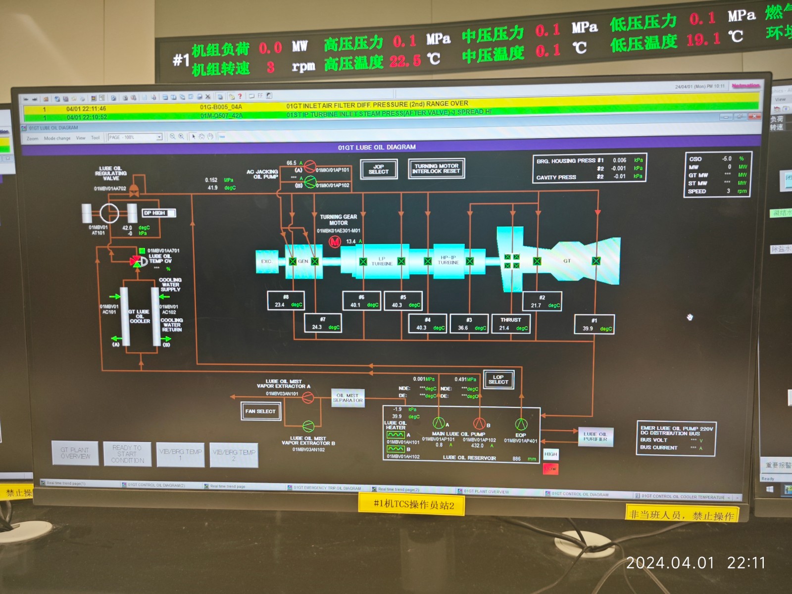 盤車投運前,參建各單位汽機、電儀、調(diào)試相關專業(yè)人員按照施工、調(diào)試方案逐一檢查盤車條件,確認機組軸系連接工作已完成、潤滑油系統(tǒng)調(diào)試完畢并取得油質(zhì)合格報告、頂軸油系統(tǒng)調(diào)試完成、TCS監(jiān)控畫面正常投用。盤車運行后,相關人員又對各項運行參數(shù)進行了詳細的檢查、檢測,確認燃機、汽輪機、發(fā)電機軸系各部件運行狀態(tài)正常。