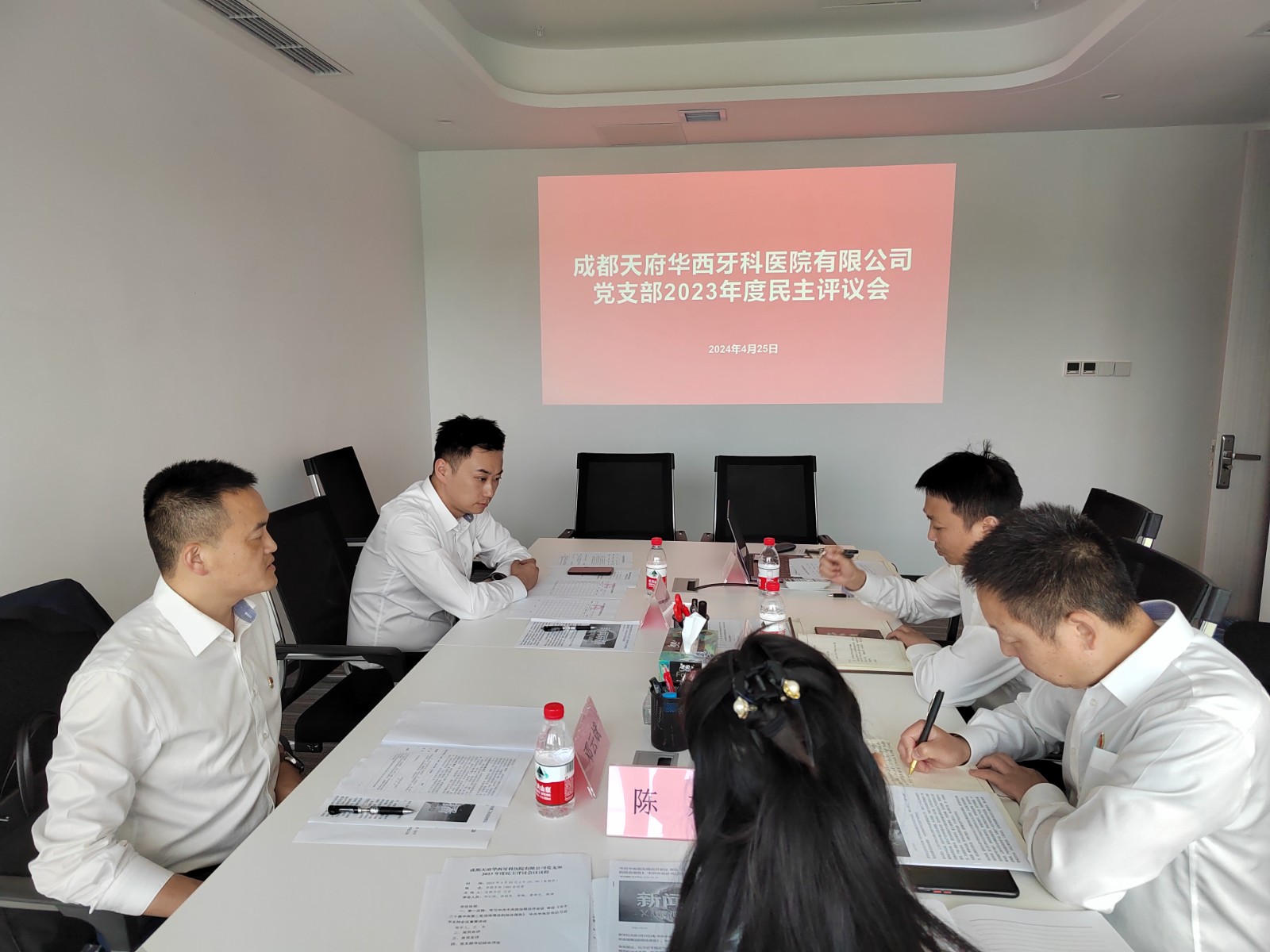 4月25日,天府華西牙科黨支部召開(kāi)2023年度民主評(píng)議會(huì)議。天府華西牙科公司黨支部書記蘭吉主持會(huì)議,華西牙科黨委委員、紀(jì)委書記鄧云斌以普通黨員身份出席會(huì)議,天府華西牙科全體黨員參加會(huì)議。