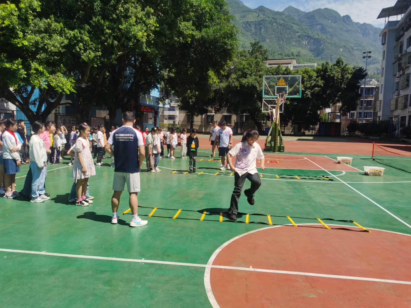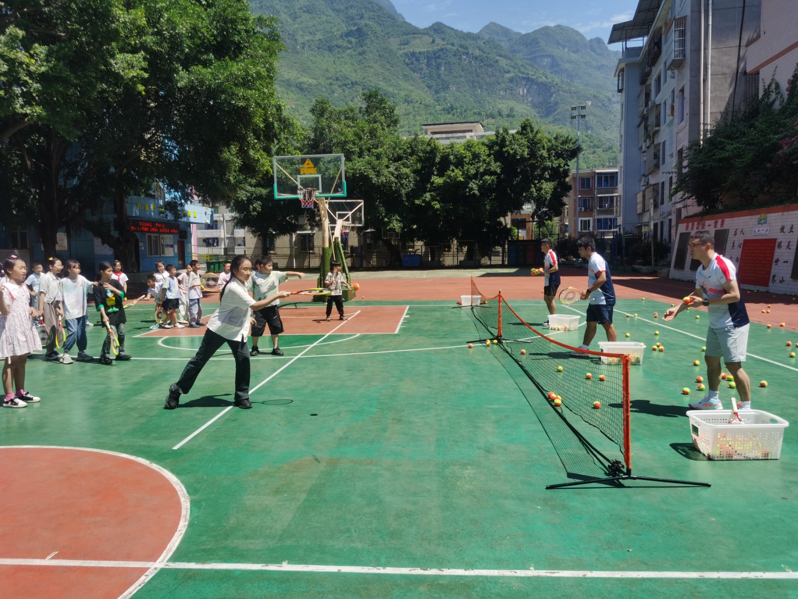 在操場上,川投國網(wǎng)公司派出網(wǎng)球教學(xué)經(jīng)驗(yàn)豐富的教練團(tuán)隊(duì),從網(wǎng)球運(yùn)動基礎(chǔ)知識普及、基礎(chǔ)技術(shù)動作指導(dǎo)體驗(yàn)、網(wǎng)球小游戲等方面開拓學(xué)生體育視野,激發(fā)學(xué)生體育項(xiàng)目興趣,促進(jìn)體教融合及學(xué)生全面發(fā)展。