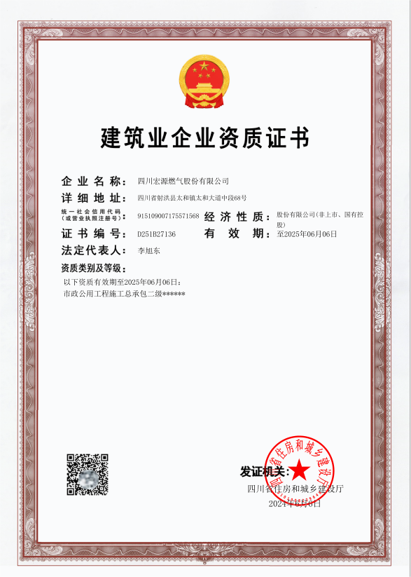 2024年6月,經(jīng)四川省住房和城鄉(xiāng)建設(shè)廳審核批準(zhǔn),四川宏源燃?xì)夤煞萦邢薰境晒?/span>取得市政公用工程施工總承包二級(jí)資質(zhì)。市政公用工程施工總承包二級(jí)資質(zhì)可承擔(dān)中壓以下燃?xì)夤艿?、調(diào)壓站、供熱面積150萬(wàn)平方米以下熱力工程及各類城市道路、各類給排水管道工程等市政公用工程施工。