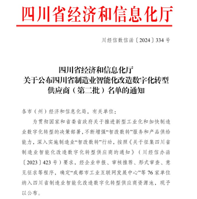 近日,四川省經(jīng)濟(jì)和信息化廳公布了《四川省制造業(yè)智能化改造數(shù)字化轉(zhuǎn)型供應(yīng)商(第二批)名單》,公司所屬智勝集成入圍“系統(tǒng)集成服務(wù)商”資源池。