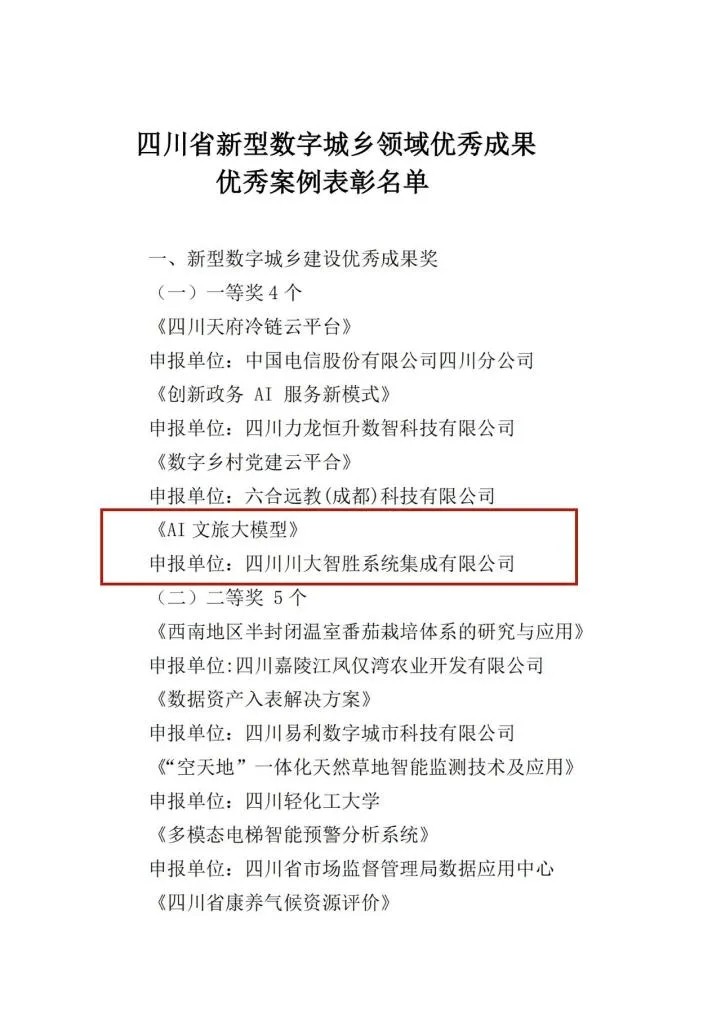 近日,四川省智慧城鄉(xiāng)大數(shù)據(jù)應(yīng)用研究會(huì)聯(lián)合四川省新型數(shù)字城鄉(xiāng)領(lǐng)域?qū)<覉F(tuán),公布了新型數(shù)字城鄉(xiāng)領(lǐng)域優(yōu)秀成果優(yōu)秀案例表彰名單,公司所屬智勝集成的AI文旅大模型榮獲新型數(shù)字城鄉(xiāng)領(lǐng)域優(yōu)秀成果一等獎(jiǎng)。