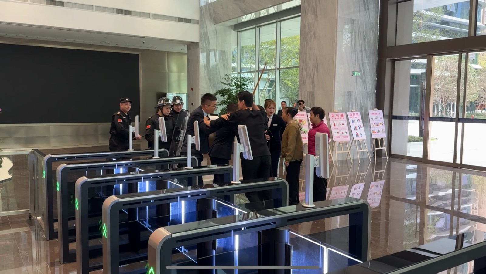 演練模擬了四名手持棍棒的“不法分子”強行闖入大廈的場景。前臺人員在第一時間發(fā)現(xiàn)異常并迅速通知現(xiàn)場安防人員,安防人員立即采取緊急措施。他們手持防暴器械,勇敢地阻止了“不法分子”的行動,迅速集結(jié)并展現(xiàn)出了卓越的團隊協(xié)作能力。在短短兩分鐘內(nèi),成功將“歹徒”制服,展現(xiàn)了全體員工高效的應(yīng)對能力。