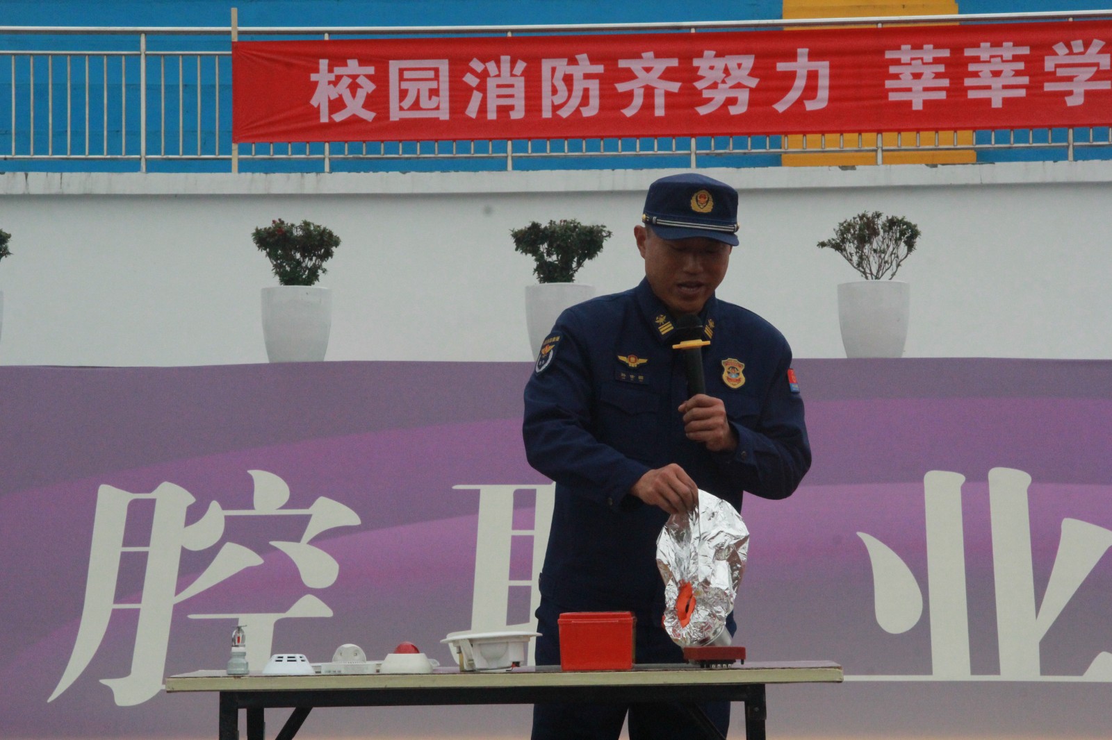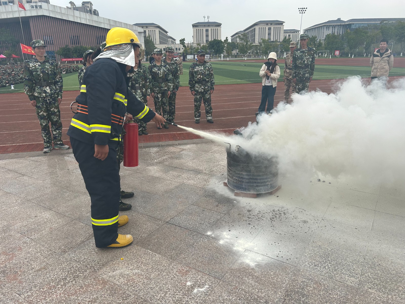 演練現(xiàn)場(chǎng),高新區(qū)消防救援大隊(duì)站長助理孫世國通過與同學(xué)們互動(dòng),進(jìn)一步交流了滅火防護(hù)服、避火服、移動(dòng)照明燈、排煙機(jī)、無齒鋸、熱成像儀和電動(dòng)擴(kuò)剪鉗等常見消防器材裝備的使用,并現(xiàn)場(chǎng)演示了滅火器使用方法,手把手指導(dǎo)學(xué)生正確使用滅火器“滅真火”。在消防員的指導(dǎo)下,同學(xué)們氣氛熱烈而有序,穿上滅火防護(hù)服,手持干粉滅火器,高壓水槍,真正體驗(yàn)了一回“消防員”。
