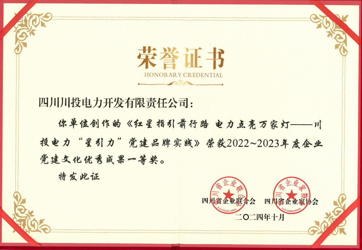 2024年以來,川投電力黨委黨建品牌“星引力”在川投能源黨委的指導下,先后榮獲川投集團第四批特色黨建品牌,《中國企業(yè)報》集團、紅旗出版社、北京大學馬克思主義學院聯(lián)合頒發(fā)的“2024年度全國企業(yè)黨建創(chuàng)新優(yōu)秀案例(黨建品牌案例)”,四川省企業(yè)聯(lián)合會、四川省企業(yè)家協(xié)會聯(lián)合頒發(fā)的“2022-2023年度黨建文化優(yōu)秀成果一等獎”等榮譽。
